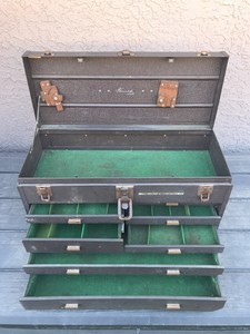 The cabinet has 7 drawers with a front panel cover that hides the drawers. Vintage metal kennedy machinist tool box. The drawers are felt lined and would make a nice craft or jewelry cabinet. The cabinet has 7 drawers with a front panel cover that hides the drawers.